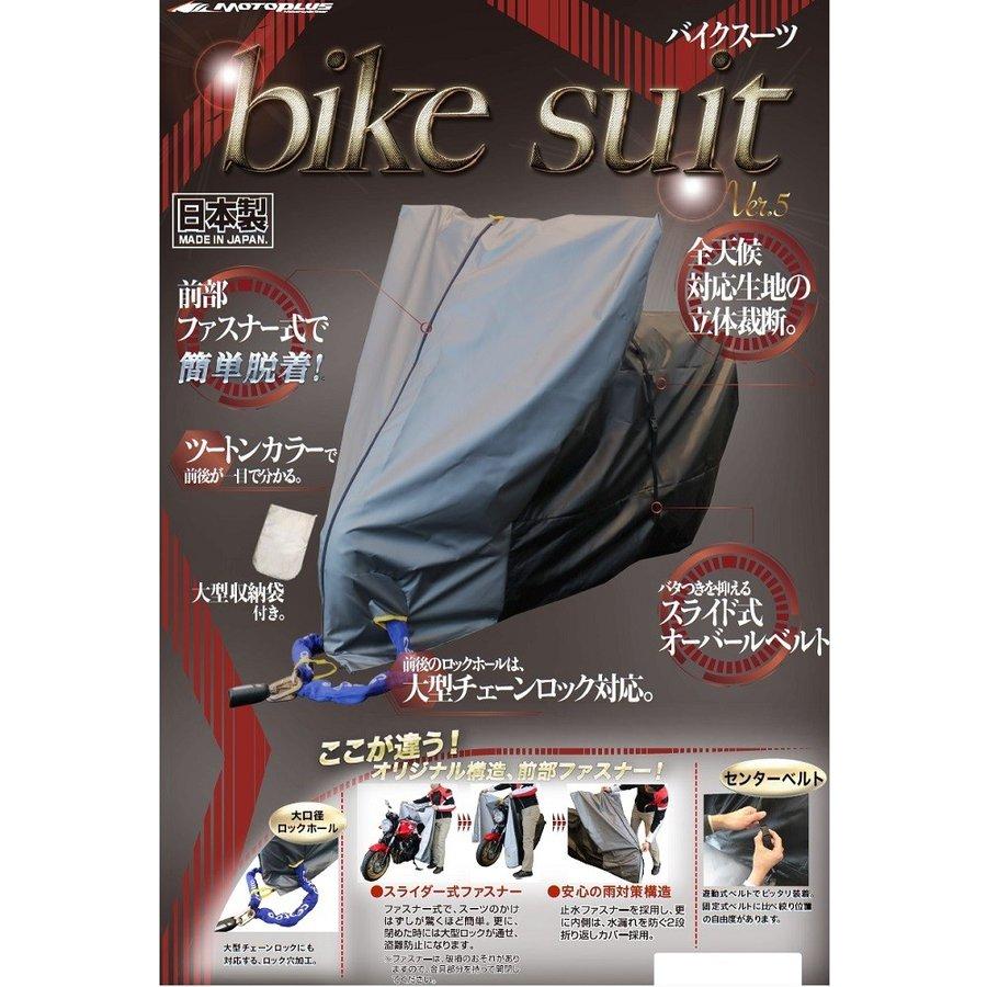 特長 前部ファスナーで簡単脱着!確かな品質の日本製バイクカバー『バイクスーツ ver.5』 ≪バイクスーツ ver.5の特徴≫ ●オリジナル構造の前部スライダー式ファスナーを採用。スーツのかけはずしが驚くほど簡単に。 ●止水ファスナーと内側に水漏れを防ぐ2段折り返しカバーを採用し、安心の雨対策構造。 ●大型チェーンロックにも対応する大口径ロックホールを前後に装備。盗難防止に効果大。 ●バタつきを抑えるスライド式オーバーベルト。遊動式で絞り位置を自由に調整。車体に合わせてピッタリ装着が可能。 ●全天候対応生地の立体裁断。 ●ツートンカラーで前後が一目瞭然。 ●大型収納袋付付属。●日本製 ≪ご注意≫※防水布製品ですが縫製品のため、ミシンの縫い目から雨水が漏れることがあります。※ゆったりサイズをご希望の方は、1ランク上のサイズをご利用ください。