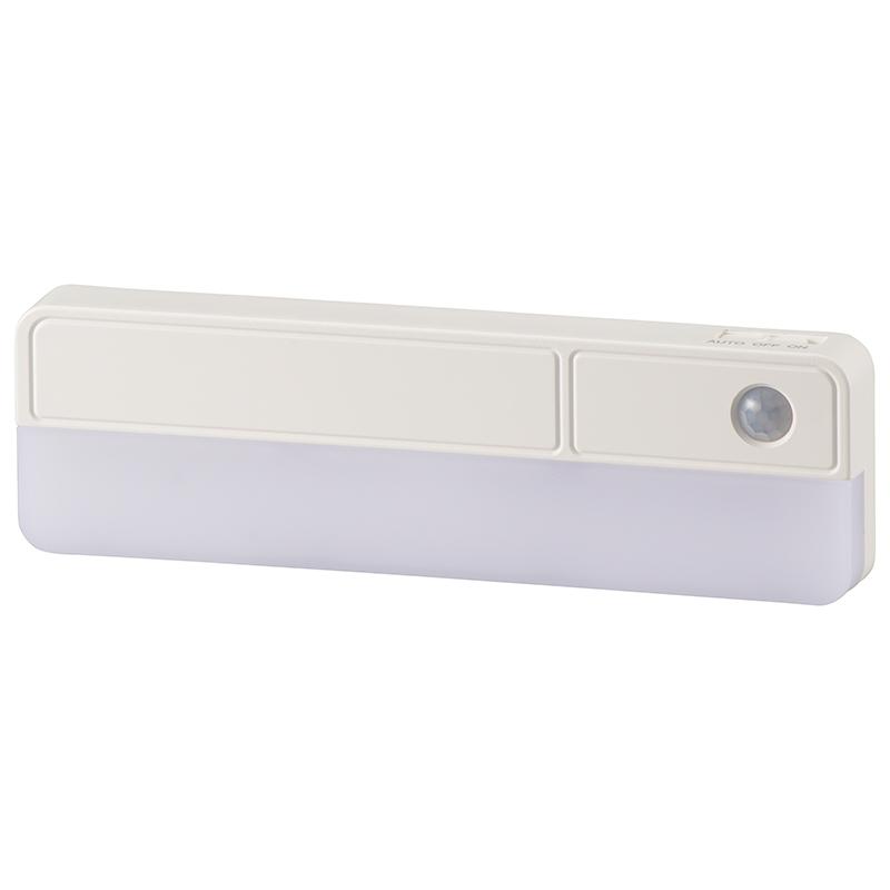 特長 ●光センサー+人感センサーのWセンサー式のLEDライトです。 暗くなると自動でスタンバイ。暗い場所で人を感知して自動点灯し、離れると 自動で消灯します。●配線不要の乾電池式なので、コンセントのない場所でも簡単に設置できます。●切替スイッチが1か所だけのシンプル設計です。 ・ON…常時点灯 ・OFF…消灯 ・AUTO…自動点灯・自動消灯●「壁掛け」「卓上」「マグネット」と様々なシーンに対応できます。 商品仕様 ●光源:白色LED3灯●人感センサー感知範囲:約3m/左右 約100°/上下 約90°●点灯保持時間:約30秒●点灯スイッチ:ON・OFF・AUTO●電源:単3形乾電池×3本(乾電池別売)●乾電池の寿命(目安):アルカリ乾電池を使用した場合、常時点灯(ON)モードで    約22時間点灯可能。また、自動点灯・自動消灯(AUTO)    モードでスタンバイ状態から1日10回の点灯で、約4ヵ月    使用可能。(1日30秒間点灯した場合)    ※乾電池の性能や使用条件により変化します。●外形寸法(約):幅220×高さ64×奥行44mm●質量:約200g(乾電池別)●付属品:ネジ(2本)※本体乾電池ボックスに収納、取扱説明書(保証書付)