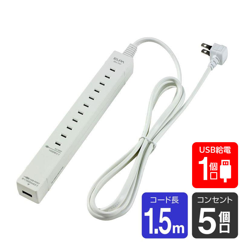 WL-USB5015B(W) スリムタップ 5個口 1.5m USBポート付_ELPA(エルパ・朝日電器)