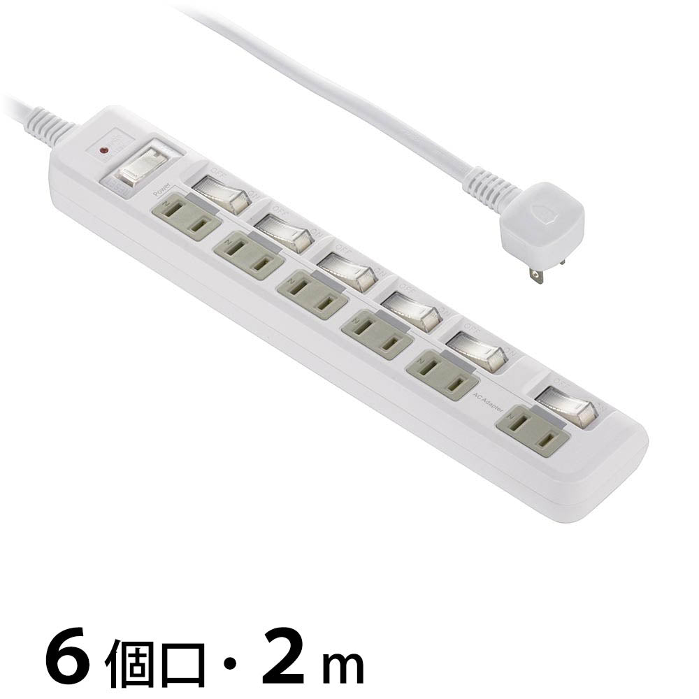 発煙ガード節電タップ(6個口/L型プラグ/コード長2m/1500W以下/過電流防止ブレーカー付/個別スイッチ付/ホワイト)_00-5282_HS-T62BHL3-W_OHM(オーム電機)