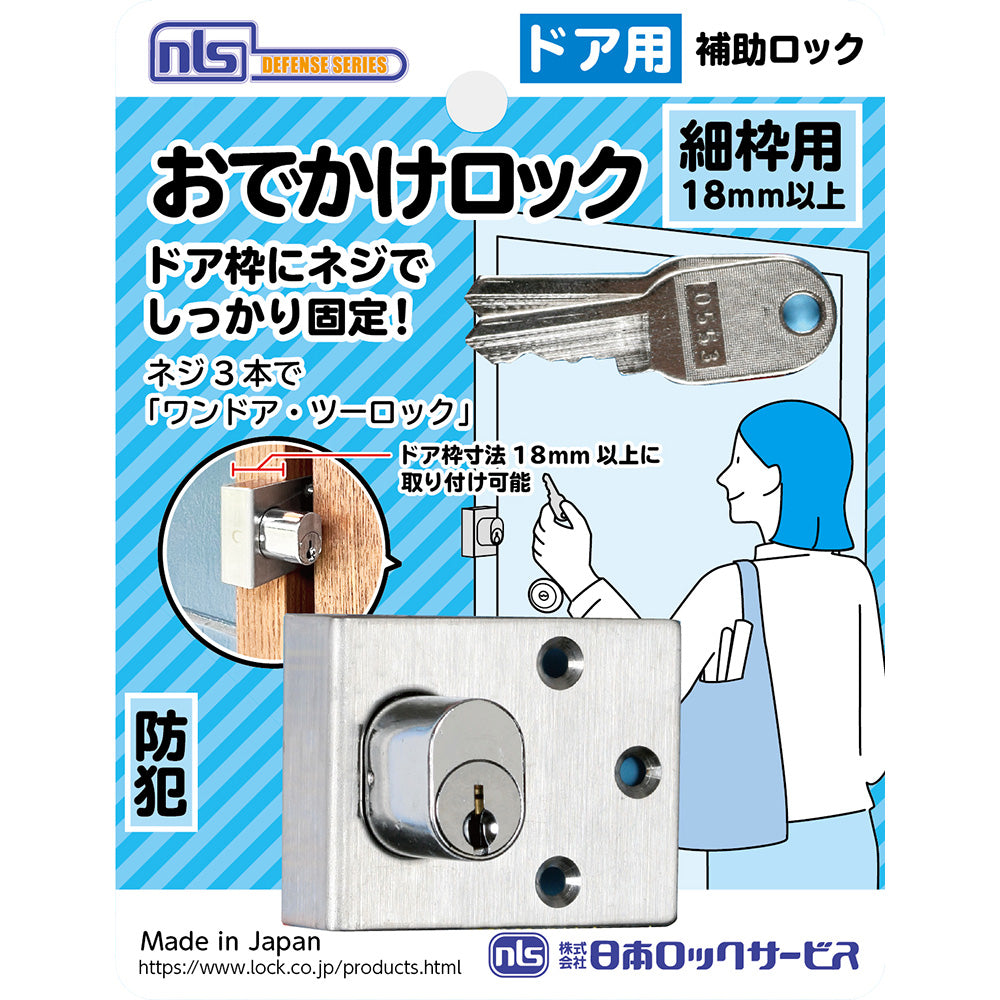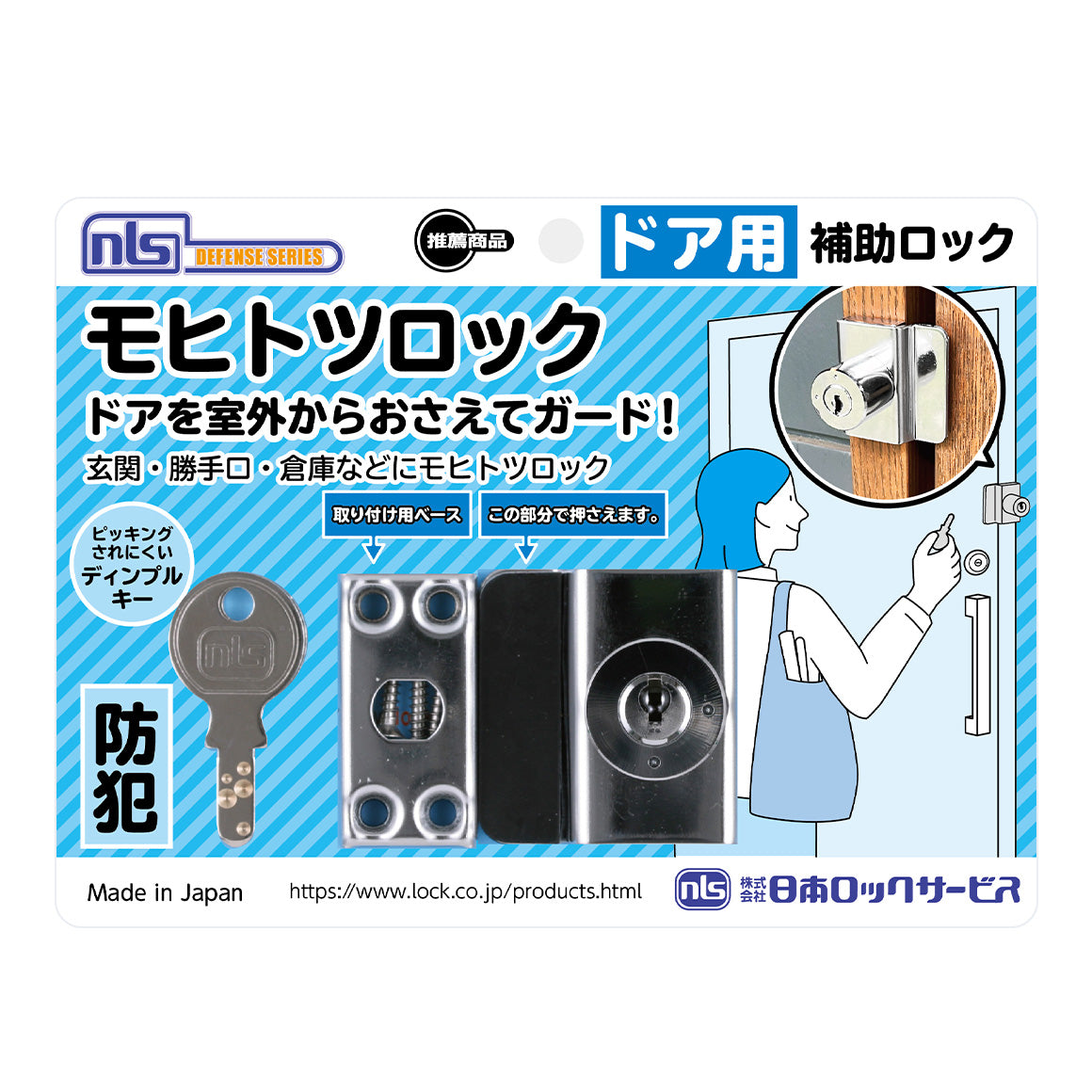おすすめポイント 外部からドアをロックします 不正開錠に強いディンプルキーを採用 予備キー付き 特長 この商品は「ドアを外側から押さえるカギ」です。 ドライバー1本で簡単にワンドア・ツーロックにすることができます。(ドア枠がスチール製の場合はドリルが必要になります) ディンプルキーと呼ばれる不正開錠に強いシリンダーを採用。 カギ番号は8000種類もあり、他社製品の12種類程度とは比較になりません。 毎日使いやすいように、くるっと回すだけの簡単格納です。 ※取り付ける枠の幅が25mm以上必要で、枠とドアの段差は2mm以内。 設置・調整 左右に限らず背の高い方であれば上枠の取り付けもできます。 取り付け用ベースを取り付ける枠に当て、鉛筆等で穴を開ける所をマークします。 マークした箇所をキリで下穴(深さ1センチ程度)をあけます。 アルミサッシに穴を開けるときは付属のドリルネジで同様に下穴を開けてください。 取り付け用ベースを付属のネジ4本で固定します。 取り付け用ベースに鍵本体を差し込みます。 本体の押さえる部分と扉に隙間があるようでしたら付属の「ライナー」を貼り調整します。 商品仕様 品名・品番 モヒトツロック DS-MH-1U 材 質 本体・シリンダー:真鍮ボール:ステンレス 付属品 ディンプルキー2本、ステンレスネジ4本、ドリルネジ1本、段差調整ライナー2枚...