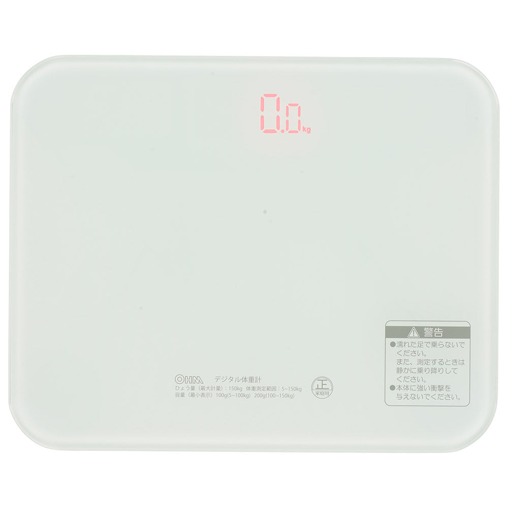 特長 ●LED表示で見やすいデジタル体重計●天板は強化ガラス使用●カラーはホワイトです 商品仕様 ●最大計量(ひょう量):150kg●最小表示(目量):5~100kg…100g、100~150kg…200g●計量範囲:5~150kg●ステップオン荷重:5kg以上●電源:DC4.5V、単4形乾電池3本(別売)●電池寿命:約1年(新しい電池使用、1日2回測定の場合)●外形寸法:(約)幅260×高さ23×奥行210mm●質量:約885g(電池含まず)●付属品:保証書付取扱説明書≪体重計精度保証範囲≫(計量範囲/精度保証範囲)・5kgをこえて75kgまで/±200g・75kgをこえて100kgまで/±300g・100kgをこえて150kgまで/±600g 【ご注意】 ※5kg未満および150kgをこえる計量については精度保証の対象外です※本製品はご家庭で使用されるためにつくられたものです。品物の売買取引や公にその物の目方を証明する場合はご使用になれませんのでご注意ください。