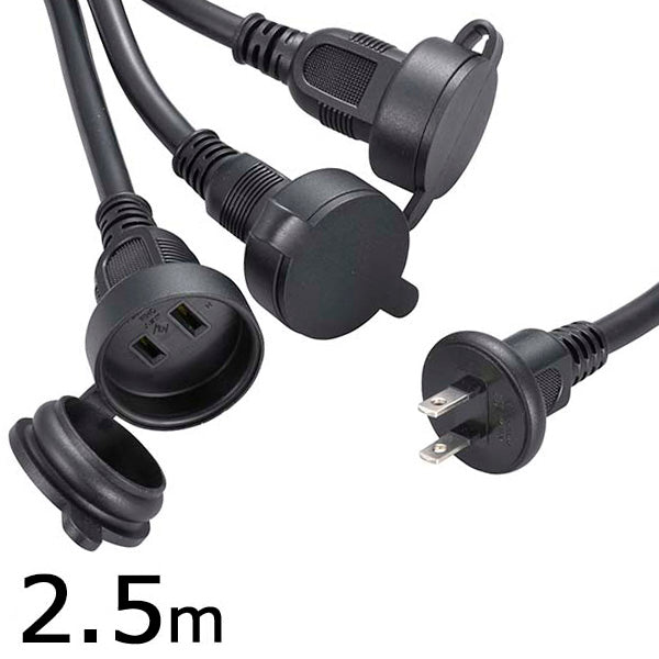 特長 ● 雨に濡れる場所で使える防雨型延長コードです。● フタ付きコンセント 使用しない時は防水キャップのフタで安心です。● 絶縁カバー付きプラグでトラッキング火災対策● 使いやすいソフトタイプ● 被ふくと保護被ふくの二重被ふくコード 商品仕様 定格 15A-125V 1500W コンセント 3ツ又 長さ 2.5m ※ 製品の仕様は予告なく変更されることがあります。