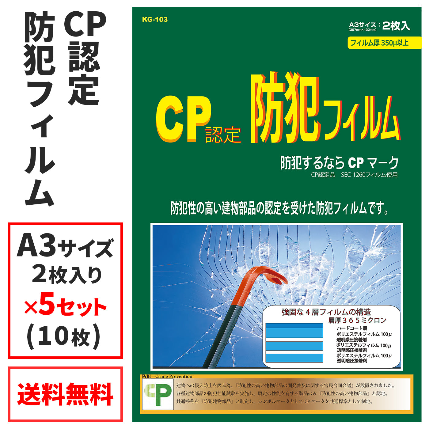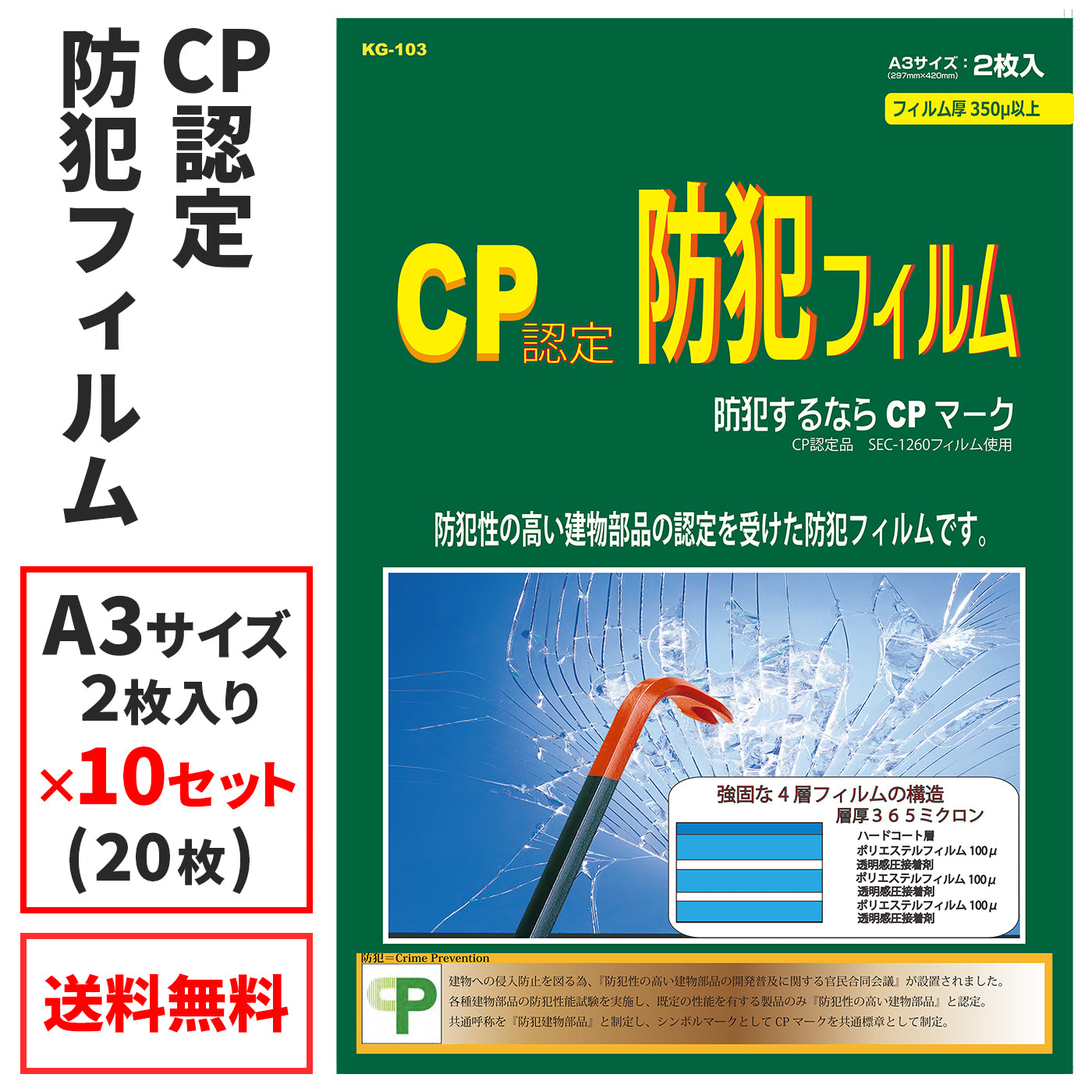 おすすめポイント ●多層フィルムで低価格●CP認証を取得●大型スキージー付属●A3サイズ2枚入り×10セット●5セット品はこちら※この商品は凸凹ガラスには施工できません。ご注意ください。※凸凹ガラス対応はこちらKG-107 特長 ●業界トップクラスの強度を持ち低価格を実現したセキュリティフィルムです。●弾丸級の衝撃もシャットアウトの多層構造。●ポリエステル樹脂のフィルムシートですので貫通防止効果、ガラス飛散防止に効果があります。●有害な紫外線も98%以上カットします。 動作・使用方法 ●侵入されやすい窓・ドアすべてに貼らないと防犯の効果はありません。●低予算で防犯対策をお考えの場合、とりあえず何か対策をとお考えの方にとても有効です。●ガラスの両面に貼ることでさらに強度が倍増します。(簡単には剥がすことはできません) 設置・調整 ●本シートはカッターで裁断することができますので、ガラスのサイズに合わせてあらかじめカットしておきます。●ガラスの汚れを落とします。(汚れが落ちにくい場合は薄めた中性洗剤で拭いてください)●中性洗剤を数滴入れた水溶液をつくりガラスに吹き付けます。●接着面の保護シートを剥がし、これにも水溶液を吹き付けます。●端の方から順に密着させます。●付属の大型ヘラでフィルムの端から気泡を抜き出し密着させます。●貼付後しばらく(3日以上)は触らず放置してください。※一度貼ったフィルムを剥がす場合は、ドライヤーなどで暖めながら剥がします。 商品仕様 ●品番・品名:CP認定防犯フィルム KG-103●材質:ポリエステルフィルム、透明感圧接着剤●入 数:A3サイズ×2枚×10セット入り●付属品:大型スキージー(へら)×1●外形寸法:W297×H420×D0.375mm(A3サイズ)