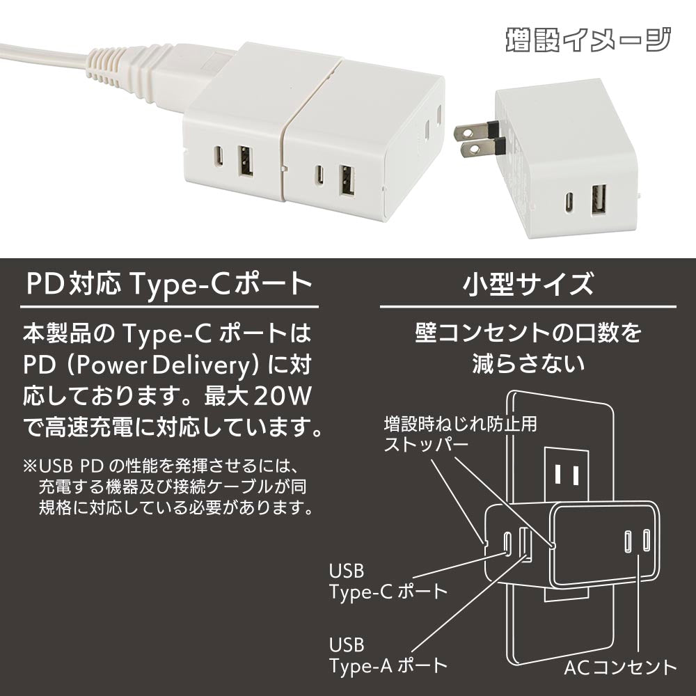 増設できるUSBチャージャー(Type-C 急速充電/PD対応20W/AC出力1400Wまで/ホワイト)_00-1099_HS-A1U2PD-24W_OHM(オーム電機)