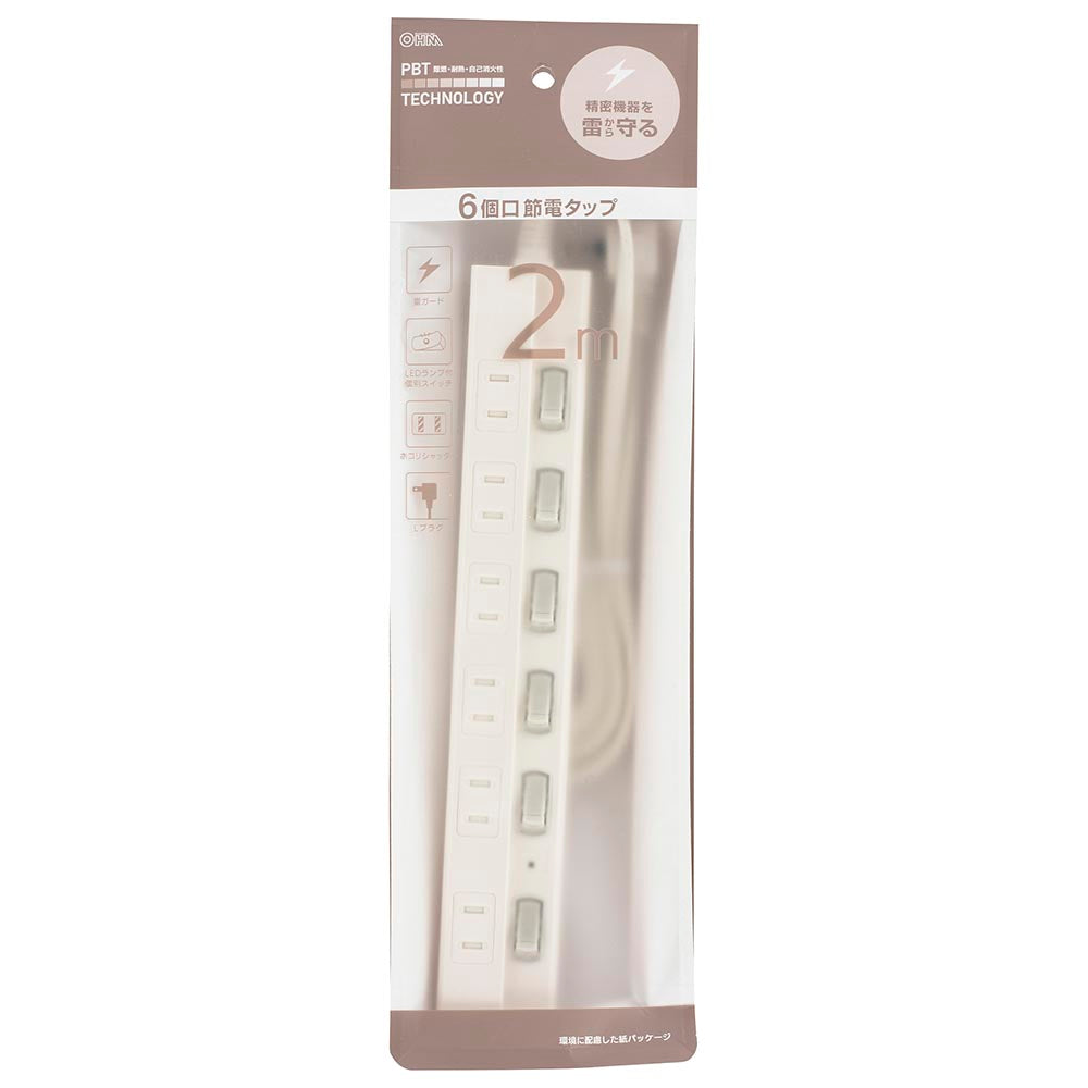 雷ガード・シャッター付き電源タップ(6個口/2m/L型プラグ/難燃・耐熱/二重被ふく/いたずら感電防止構造/ホワイト)_00-1577_HS-TPK62W-22_OHM(オーム電機)