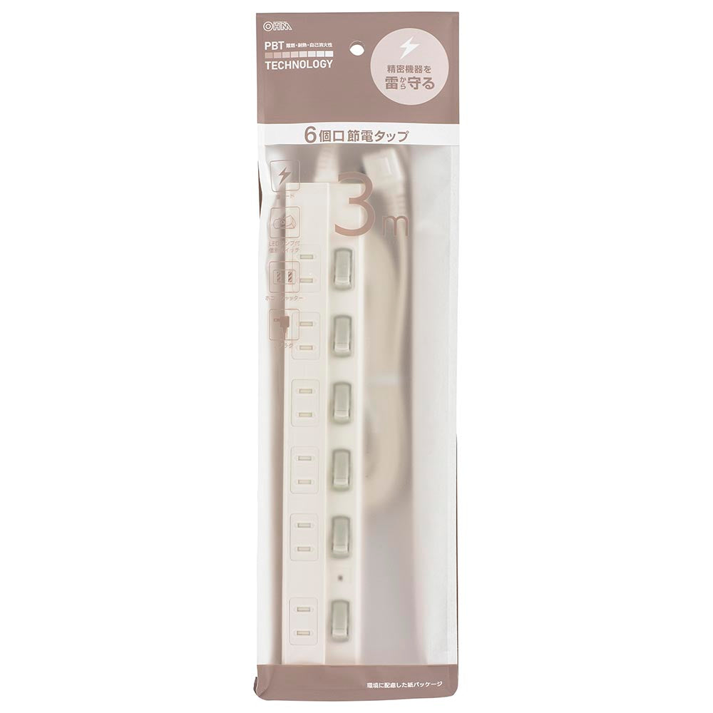 雷ガード・シャッター付き電源タップ(6個口/3m/L型プラグ/難燃・耐熱/二重被ふく/いたずら感電防止構造/ホワイト)_00-1578_HS-TPK63W-22_OHM(オーム電機)