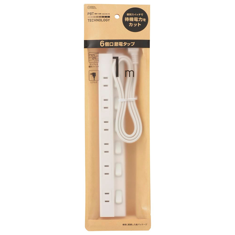 個別スイッチ付節電タップ(6個口/1m/L型プラグ/PBT樹脂使用/二重被ふくコード/ホワイト)_00-1600_HS-TP61EDLP22_OHM(オーム電機)