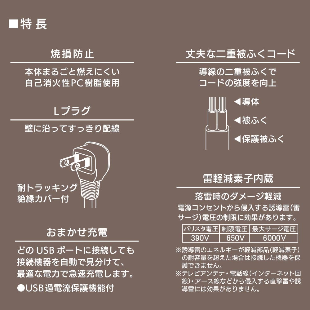 ●接続機器を自動で見分けて最適な電力で急速充電する「おまかせ充電」(USB過電流保護機能付き)