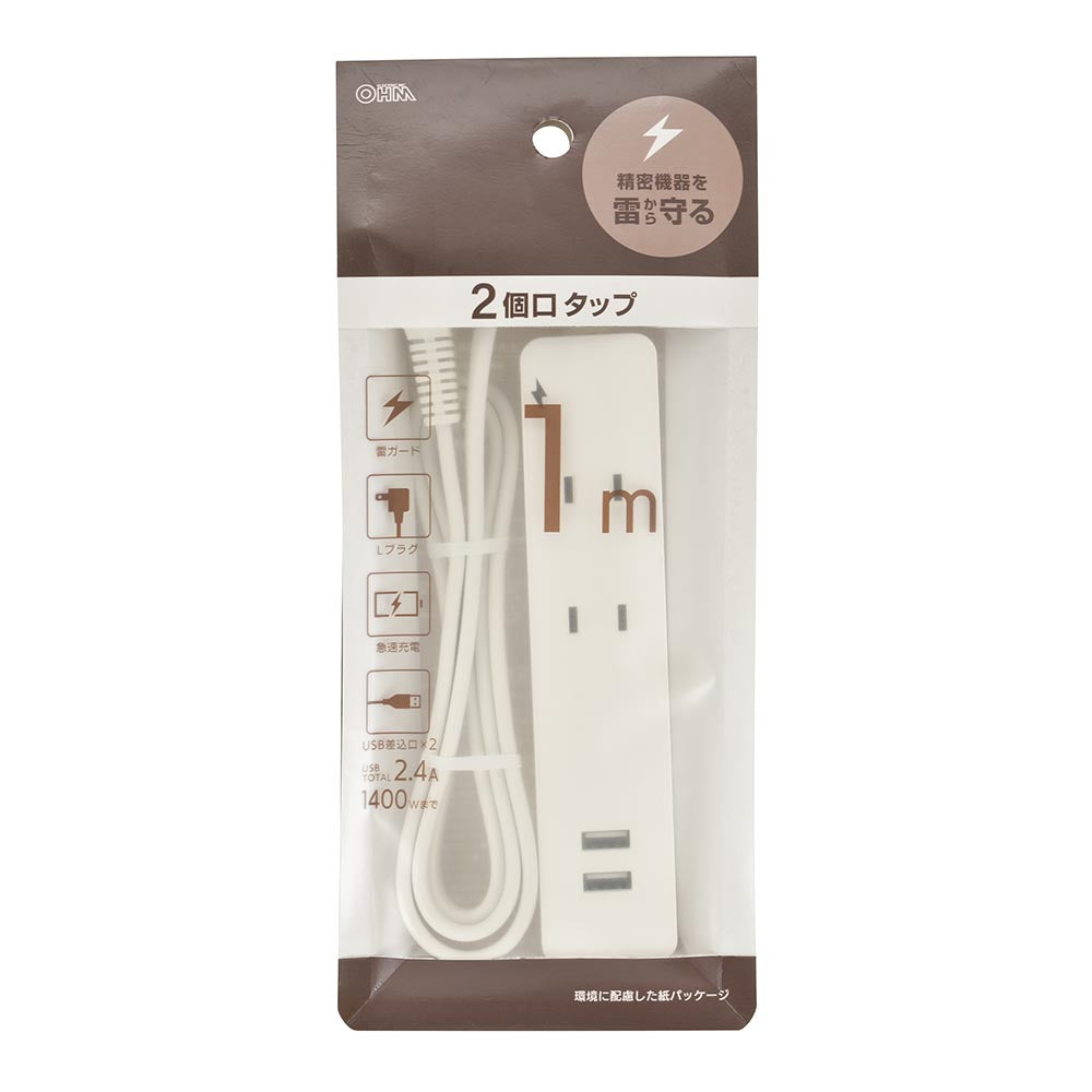 雷ガード・USB・コード付タップ(2個口/1m/USB2個口合計2.4A/Lプラグ/2個口/1m/ホワイト)_00-1655_HS-TKU21W22_OHM(オーム電機)