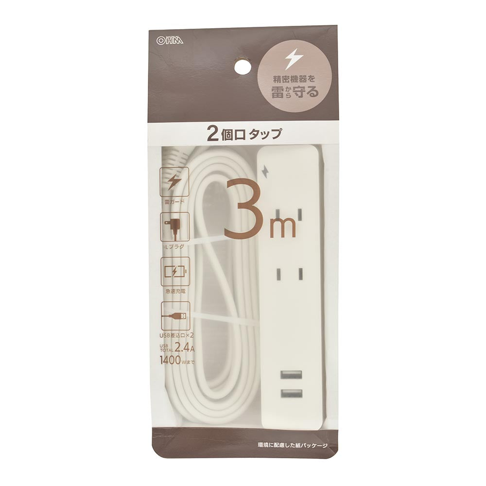 雷ガード・USB・コード付タップ(2個口/3m/USB2個口合計2.4A/Lプラグ/ホワイト)_00-1657_HS-TKU23W22_OHM(オーム電機)