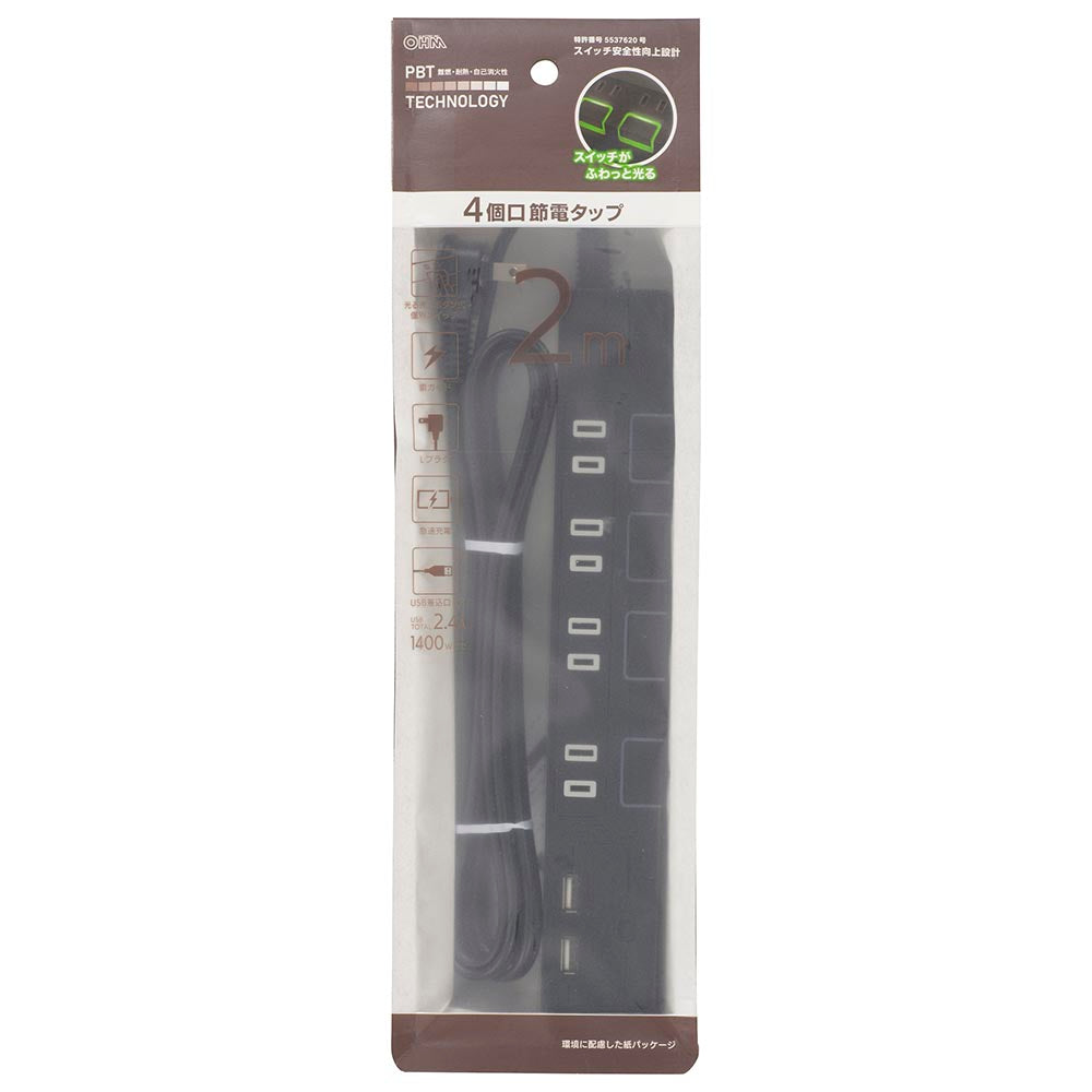 USB充電ポート2口付雷ガード付節電タップ(4個口/コード長2m/ボタン式個別スイッチ/ブラック)_00-1669_HS-TPKU42K-22_OHM(オーム電機)