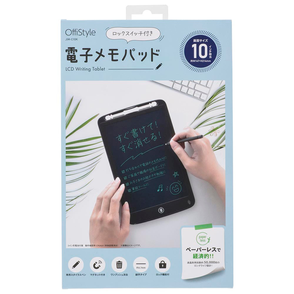 電子メモパッド(10インチ相当/163g/厚さ5mm/CR2025コイン形電池×1個付属/専用スタイラスペン&ペンホルダー付属/背面マグネット/0.7mm細字/ロックスイッチ付き/ブラック)_00-5642_JIM-C10K_OHM(オーム電機)