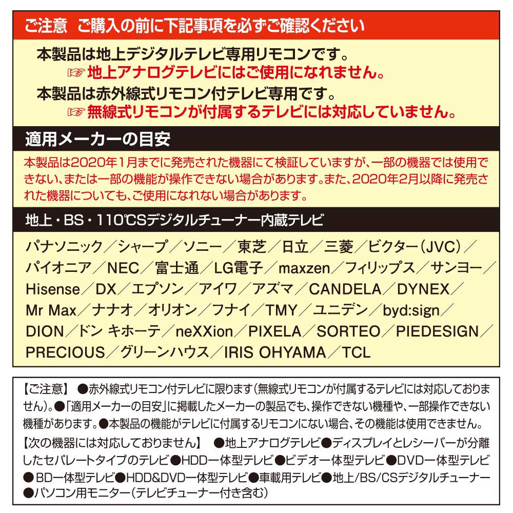 ※本製品は地上デジタルテレビ専用リモコンです。地上アナログテレビにはご使用になれません。
