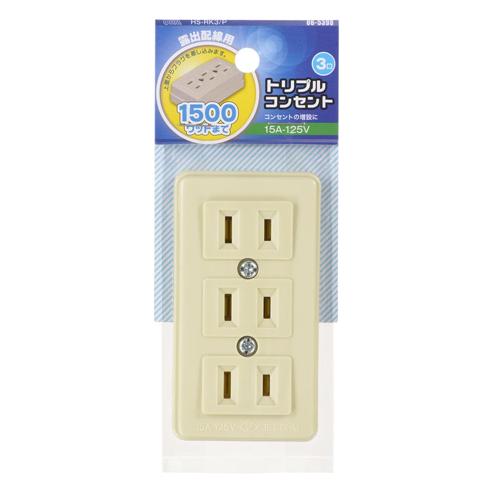 トリプルコンセント(3口/露出配線用/1500Wまで/15A-125V/ホワイト/パッケージあり)_06-5398_HS-RK3/P_OHM(オーム電機)