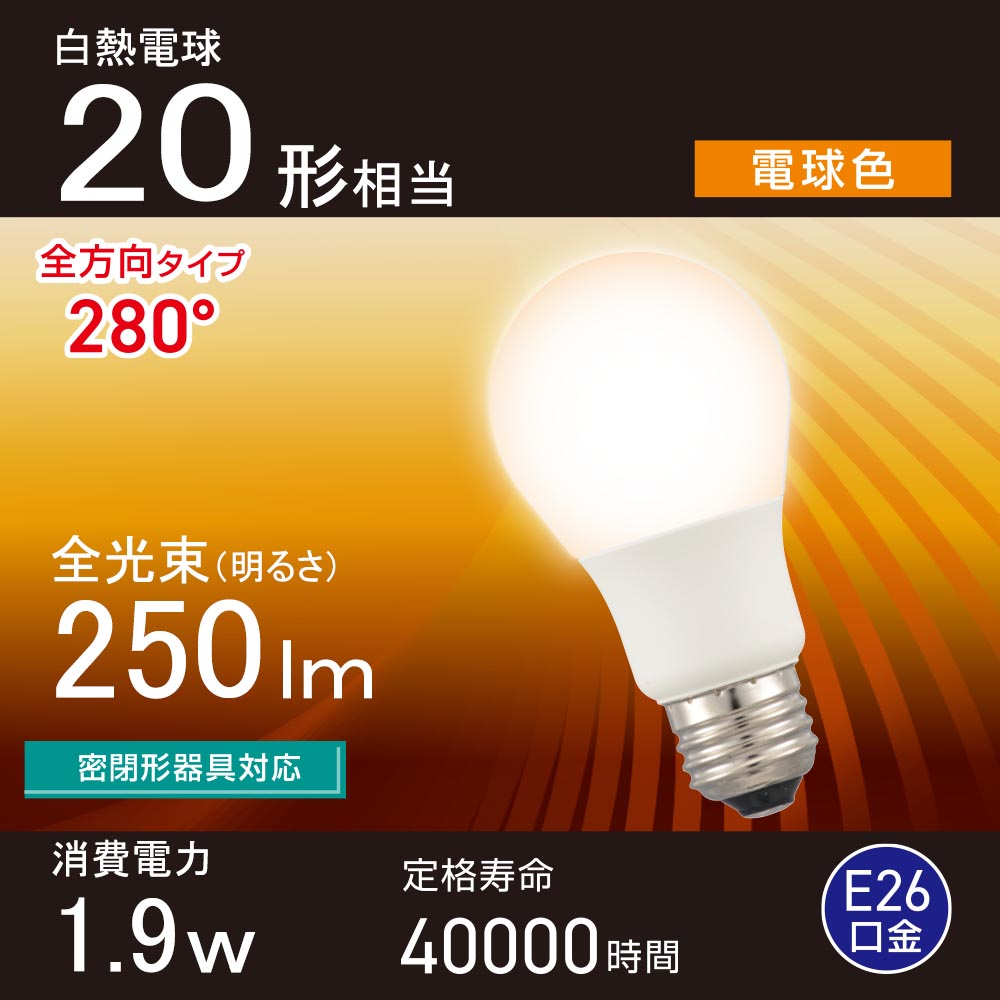 LED電球(20形相当/電球色/250 lm/1.9W/E26/Ra83/全方向配光280°/密閉形器具対応)_06-5451_LDA2L-G AG59_OHM(オーム電機)