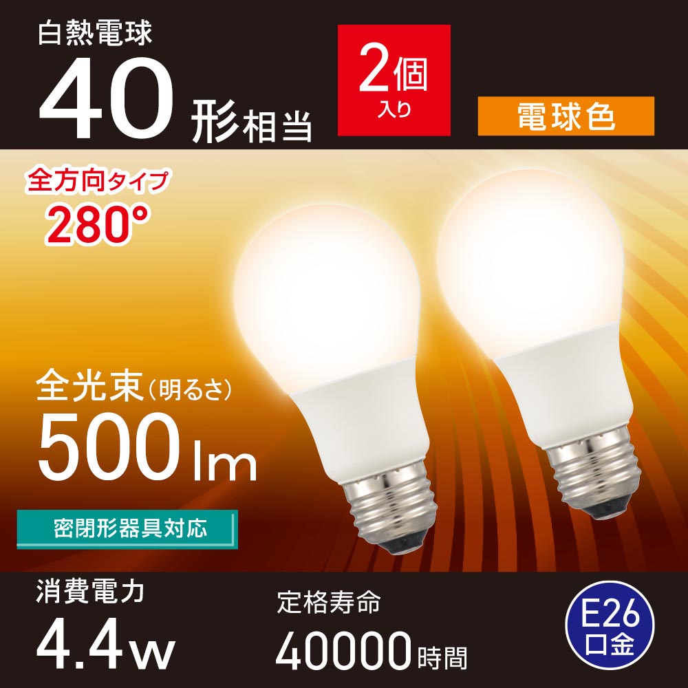 LED電球(40形相当/電球色/500 lm/4.4W/E26/Ra83/全方向配光280°/密閉形器具対応/2個入)_06-5463_LDA4L-G AG59 2P_OHM(オーム電機)