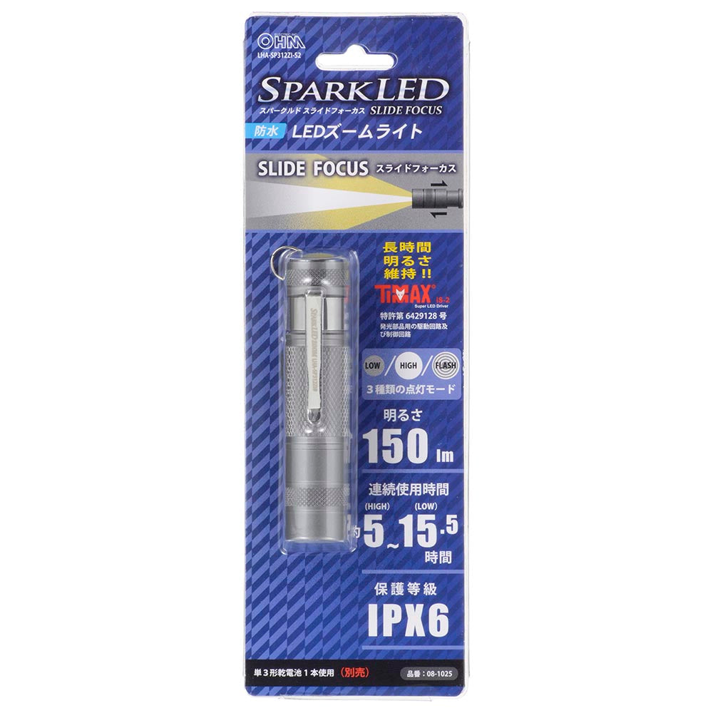 LEDズームライト(150Lm/スライドフォーカス/耐水仕様IPX6/単3形×1本使用/アルミボディ/連続使用Lowで15.5時間)_08-1025_LHA-SP312ZI-S2_OHM(オーム電機)