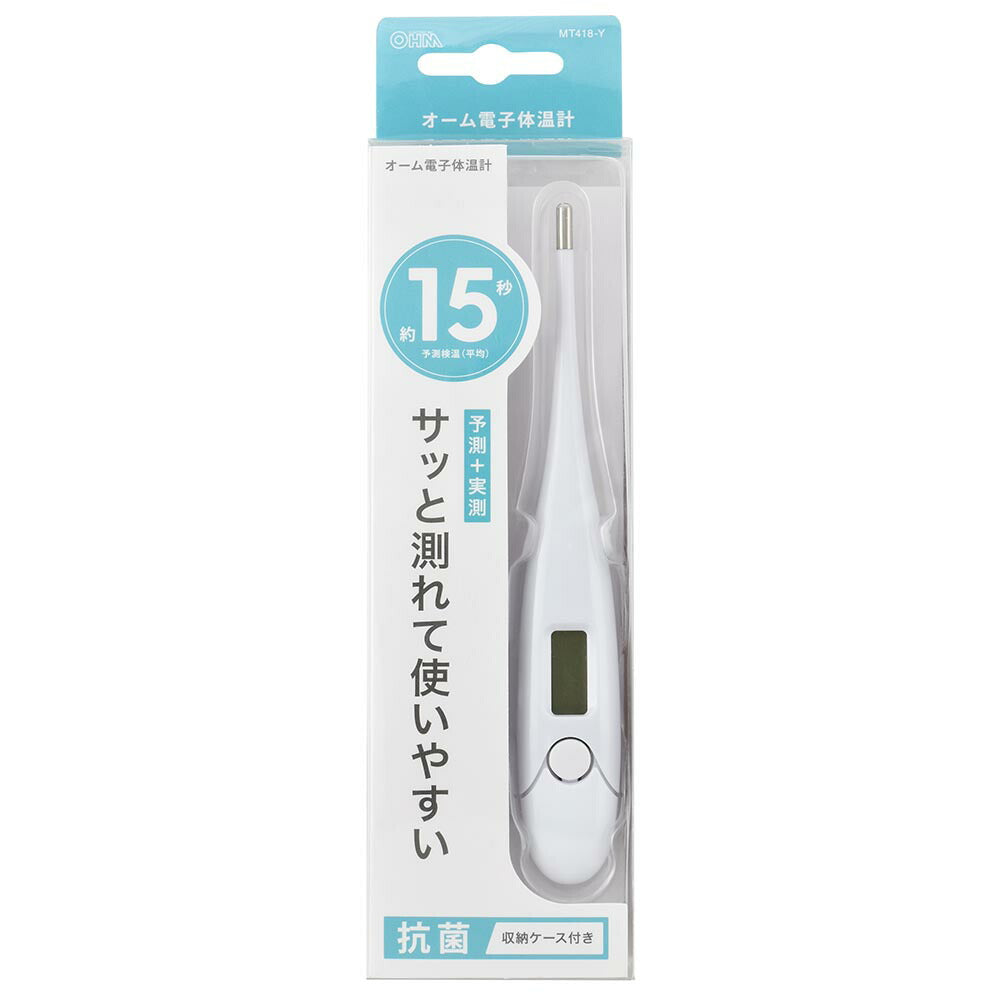 電子体温計(予測・実測式/予測検温15秒/測定精度±0.1℃/オートパワーオフ/収納ケース付/ボタン電池LR41付属/ホワイト)_08-1437_MT418-Y_OHM(オーム電機)