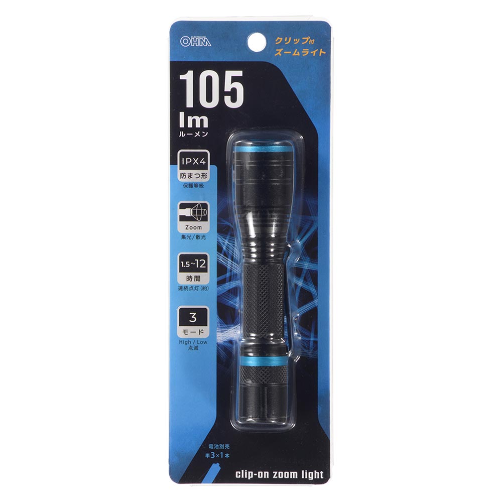 クリップ付きズームライト(105 lm/連続点灯1.5~12時間/保護等級IPX4/単3形×1本使用)_08-1667_LHA-PZ11A7_OHM(オーム電機)