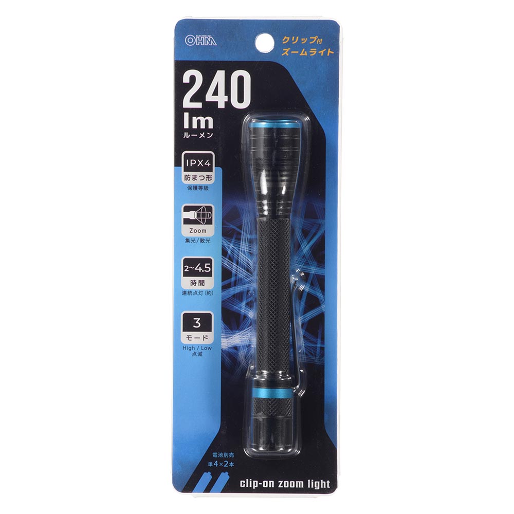 クリップ付きズームライト(240 lm/連続点灯2~4.5時間/保護等級IPX4/単4形×2本使用)_08-1668_LHA-PZ24A7_OHM(オーム電機)