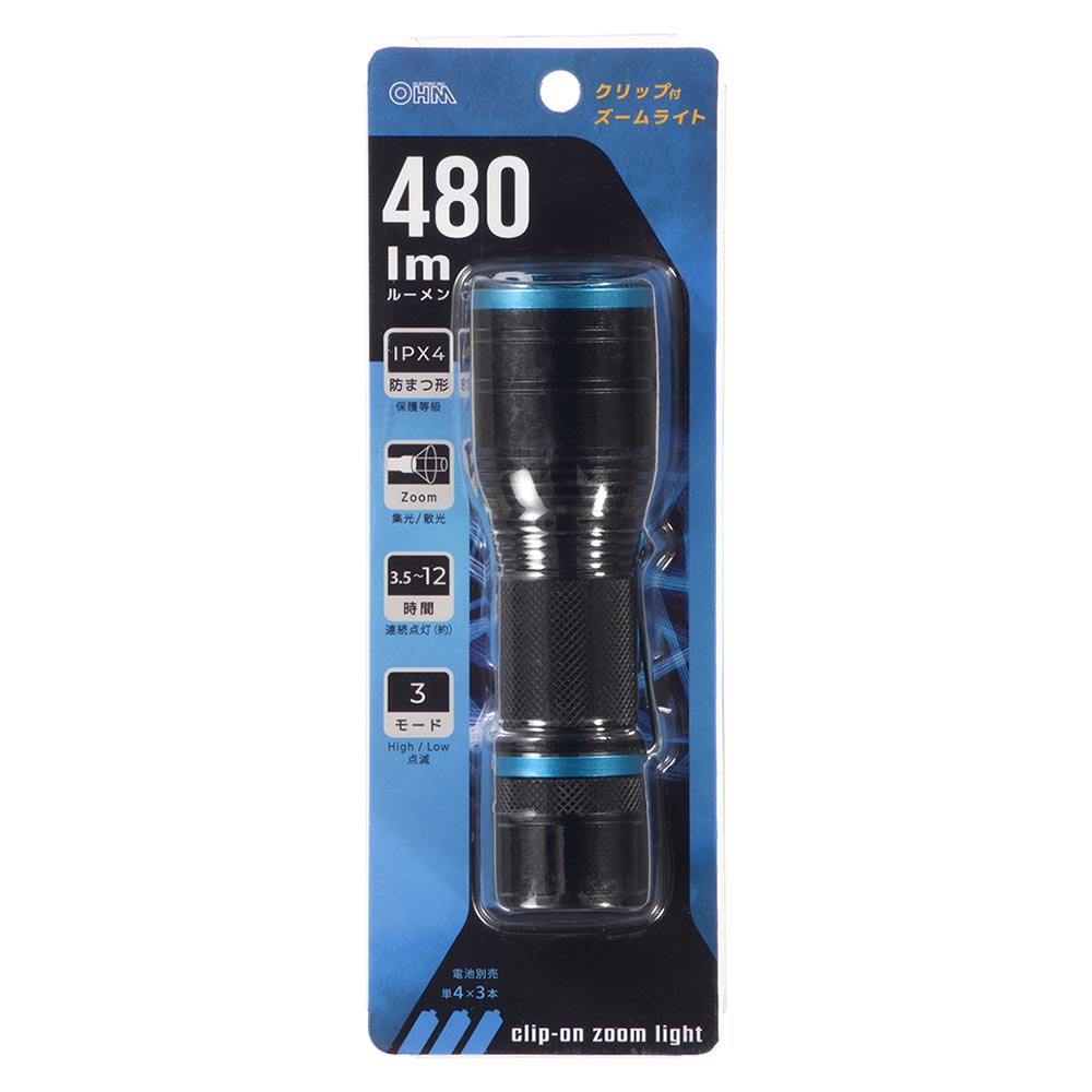 クリップ付きズームライト(480 lm/連続点灯3.5~12時間/保護等級IPX4/単4形×3本使用)_08-1670_LHA-PZ48A7_OHM(オーム電機)