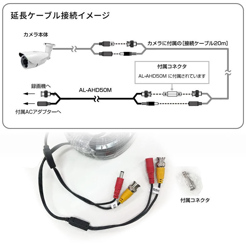 ●防犯カメラに付属しているケーブル、1本+AL-AHD50M、1本=合計70mの延長が可能です