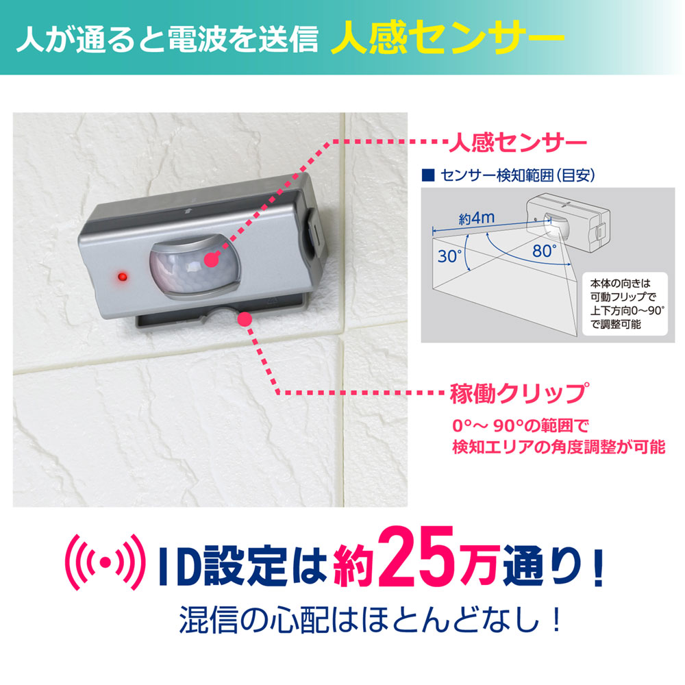 ● センサーの検知エリアを人が通ると電波を送信し、受信器のチャイムでお知らせします。