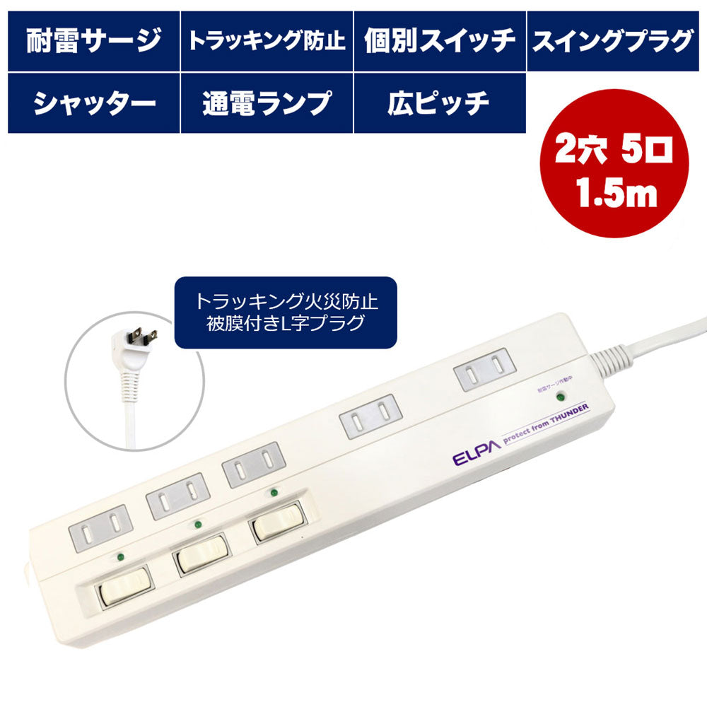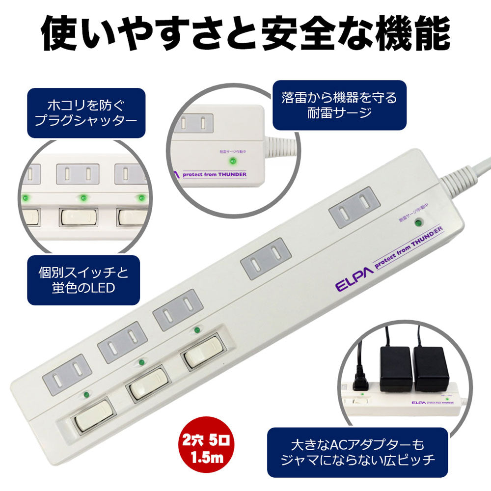 WLS-5015B(W)_1668100_耐雷サージ機能付マルチタップ 5個口 1.5m_ELPA(エルパ・朝日電器)