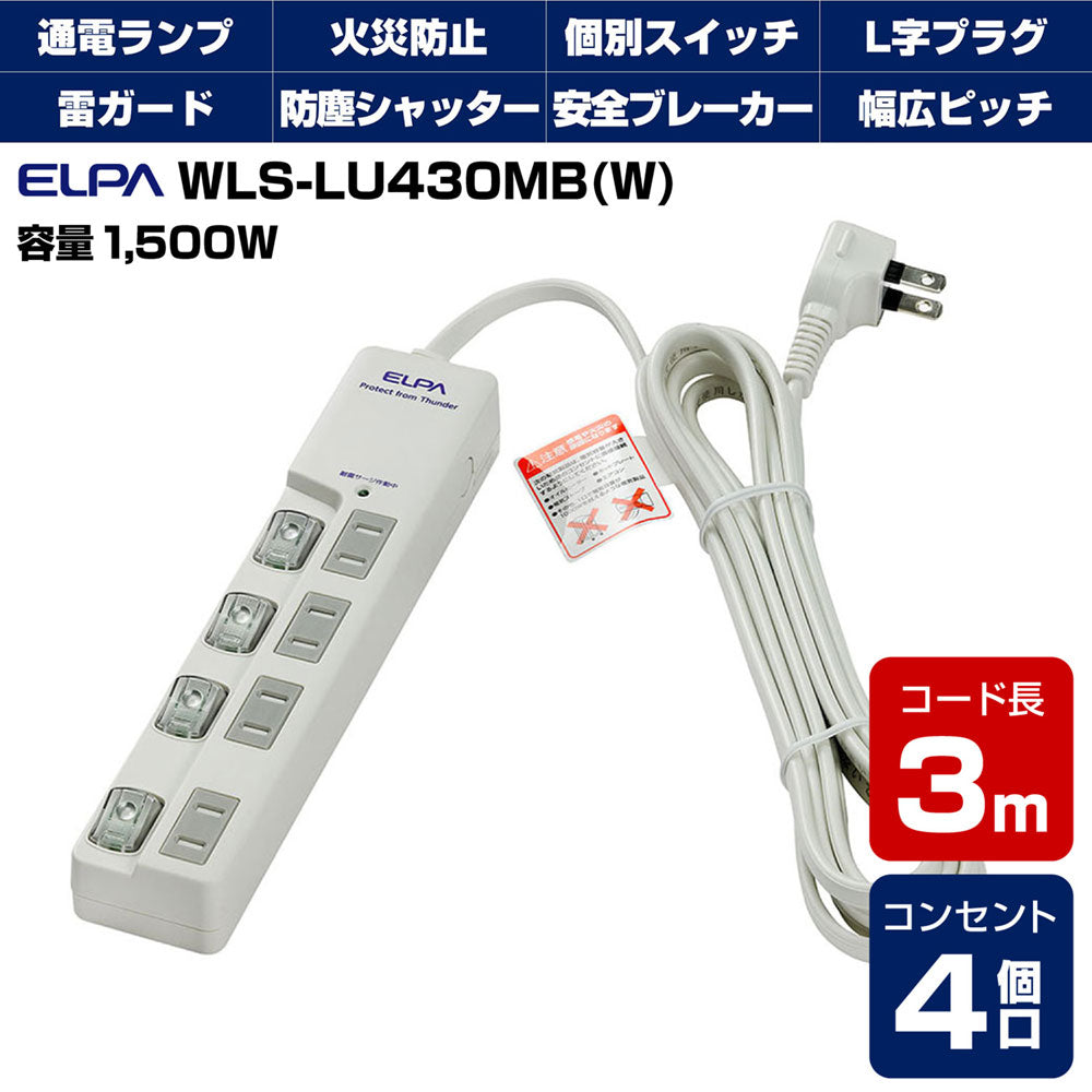WLS-LU430MB(W) LEDランプスイッチ付タップ 上挿し 4個口 3m ブレイカー付_ELPA(エルパ・朝日電器)