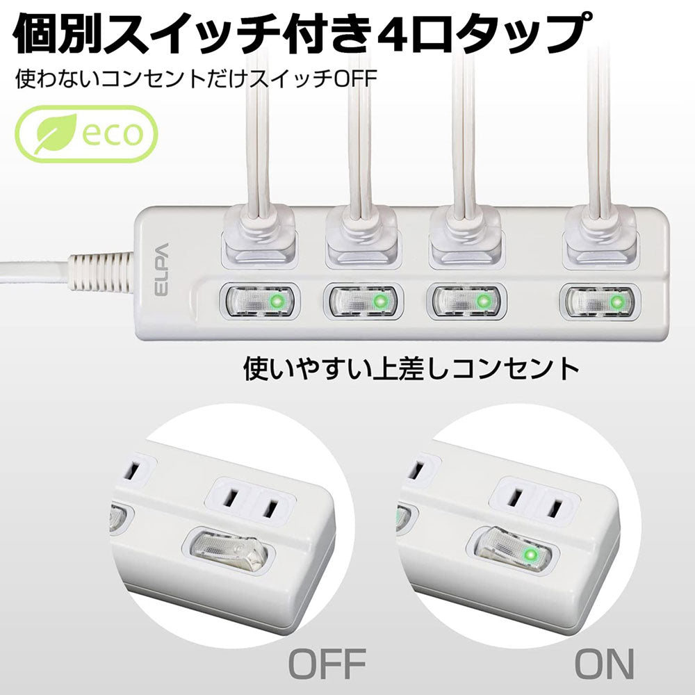 WLS-LU43EB(W)_1782800_スイッチ付タップ LEDランプ 上挿し 4個口 3m_ELPA(エルパ・朝日電器)